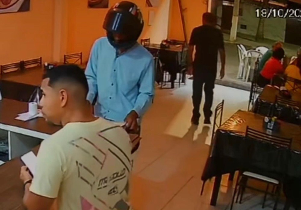Nas imagens, é possível ver o atirador usando capacete, entrando na pizzaria e simulando fazer um pedido. Quando a vítima vira as costas, o criminoso dispara três vezes, atingindo Carlos André. Em seguida, o suspeito foge em uma motocicleta que o aguardava do lado de fora.