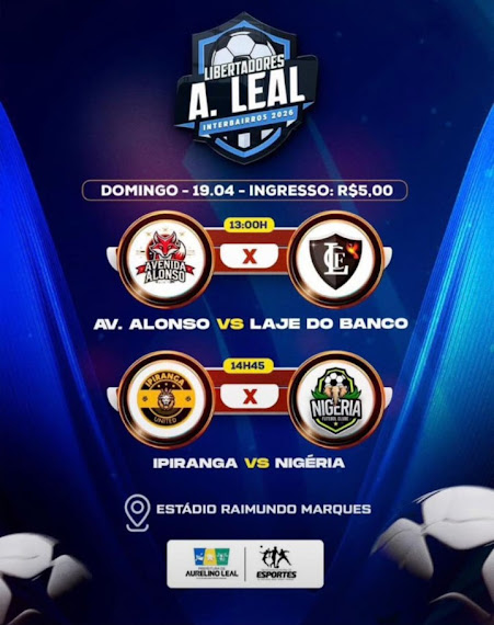 6A 8ª rodada do agitado e empolgante Campeonato Interbairros de Futebol 2026 de Aurelino Leal promete fortes emoções no próximo domingo, 19/04, com dois duelos que envolvem briga pela parte de cima da tabela e luta contra a eliminação antecipada. Os duelos acontecem no estádio Raimundo Marques entre Avenida Alonso x Laje e Ipiranga x Nigéria. Com informações do Canal de Notícias Edenildo Braga