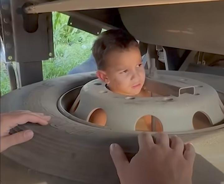 De acordo com informações, a criança, identificada como Henry, brincava com amigos na rua quando decidiu se esconder embaixo do veículo, utilizando a parte inferior da carreta como esconderijo. Em determinado momento, acabou prendendo a cabeça na estrutura da roda reserva e começou a gritar por socorro.