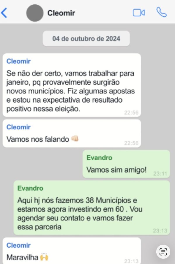 Mensagens obtidas pela investigação indicam que Evandro disse a um interlocutor que teria “comprado” dezenas de prefeituras baianas. Em uma das conversas, ele relata ter fechado acordos com 38 prefeitos e estar em negociação com outros 60 gestores municipais.